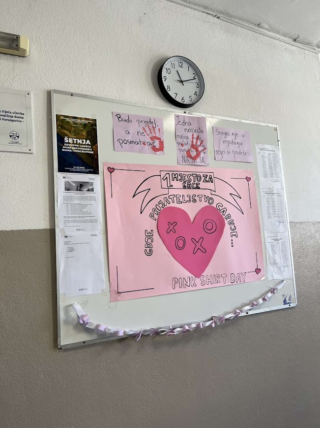 🩷🌸 Također, obilježen je i Dan ružičastih majica (Dan borbe protiv vršnjačkog nasilja). Učenici su nošenjem rozih majica poslali jasnu poruku da naša škola ne podržava nijedan oblik nasilja. Izrađeni su edukativni plakati sa snažnim porukama o važnosti tolerancije, razumijevanja i nenasilne komunikacije. Kroz razgovor i zajedničke aktivnosti dodatno je naglašena važnost stvaranja sigurnog i podržavajućeg školskog okruženja za sve učenike.